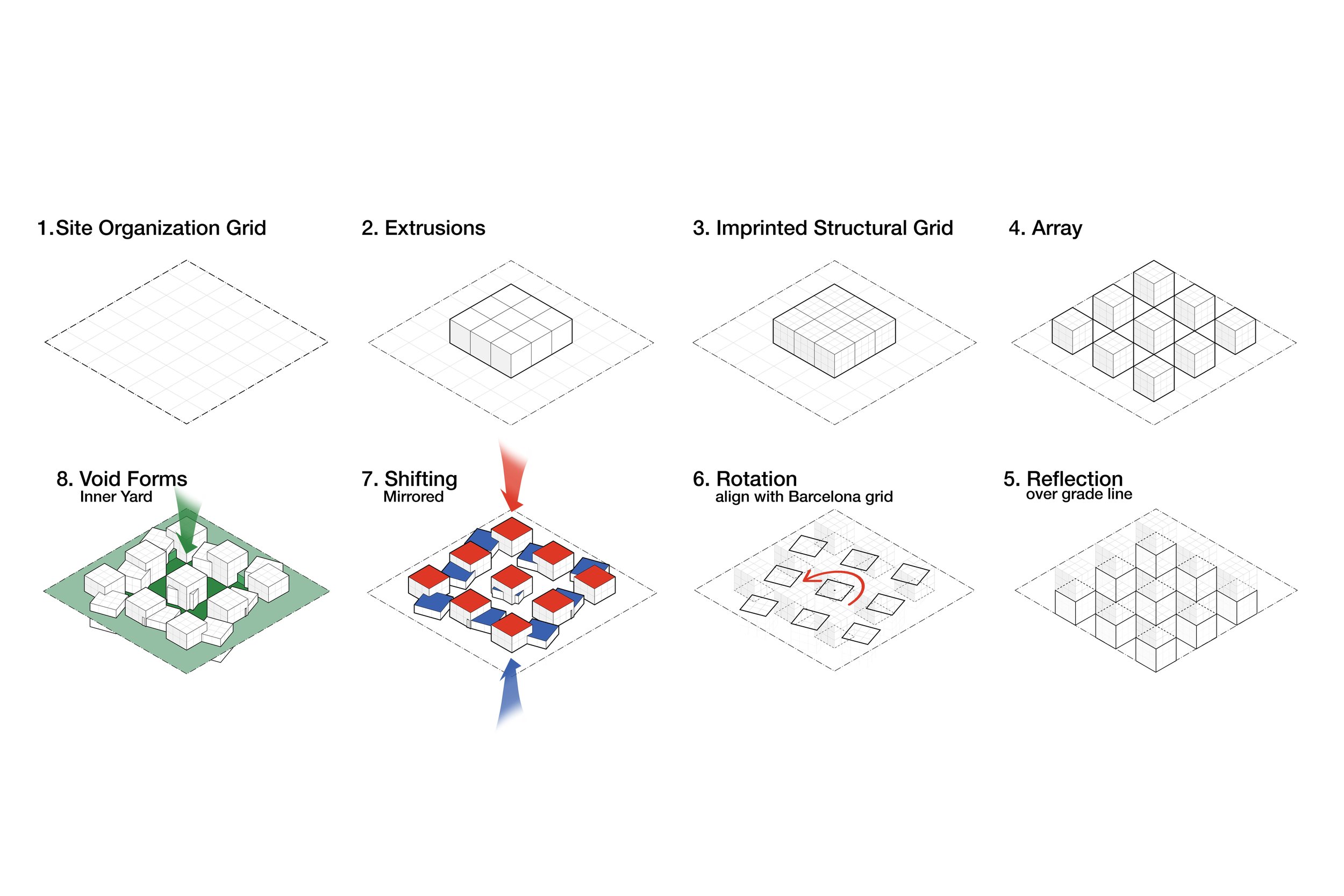 Located directly across from Mies van der Rohe’s Barcelona Pavilion, bca-msm is a contemporary art museum designed to house Las Meninas by Velázquez and its variations by Picasso. The project engages two intersecting grids—one aligned with Mies’ pavilion, the other with Barcelona’s city plan, forming the foundation for nine distinct pavilions. Each pavilion is a variation on a shared architectural language of line, plane, and volume, echoing both the spatial rigor of Mies and the conceptual layering of the artworks within. The result is a museum that positions itself not as a replica, but as an original, deeply informed by its context, its contents, and the idea of transformation through variation.